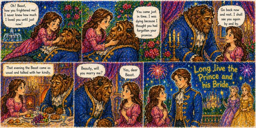 Beauty and the Beast by Andrew Lang Part 13: Love Revealed “Oh! Beast, how you frightened me!” she cried. “I never knew how much I loved you until just now, when I feared I was too late to save your life.” “Ôi! Quái Vật, anh làm con sợ quá!” cô kêu lên. “Con chưa bao giờ…