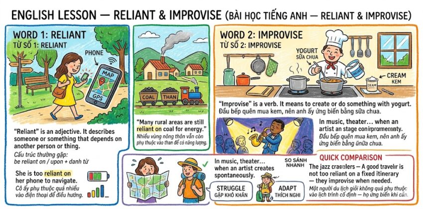 ENGLISH LESSON — RELIANT & IMPROVISE BÀI HỌC TIẾNG ANH — RELIANT & IMPROVISE WORD 1: RELIANT TỪ SỐ 1: RELIANT“Reliant” is an adjective. It describes someone or something that depends on another person or thing. “Reliant” là tính từ. Nó mô tả ai đó hoặc cái gì đó phụ thuộc vào người hoặc thứ…