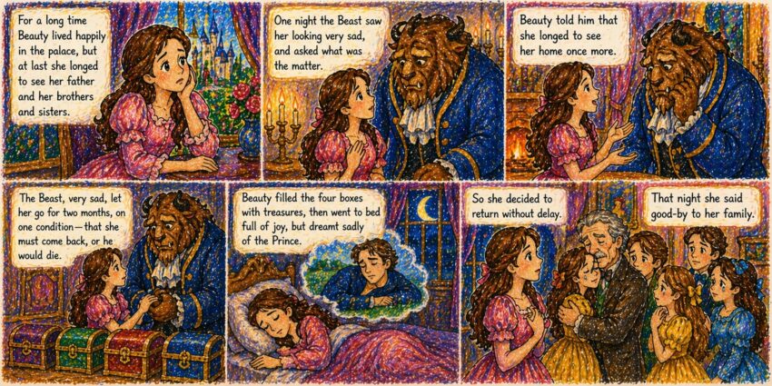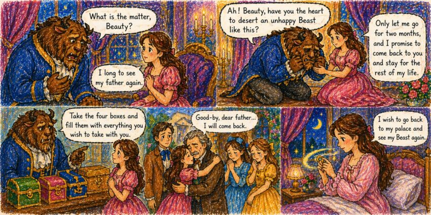 Beauty and the Beast by Andrew Lang Part 10: Longing for Home So everything went on for a long time, until at last, happy as she was, Beauty began to long for the sight of her father and her brothers and sisters. Vậy là mọi thứ diễn ra trong một thời gian dài, cho đến cuối…