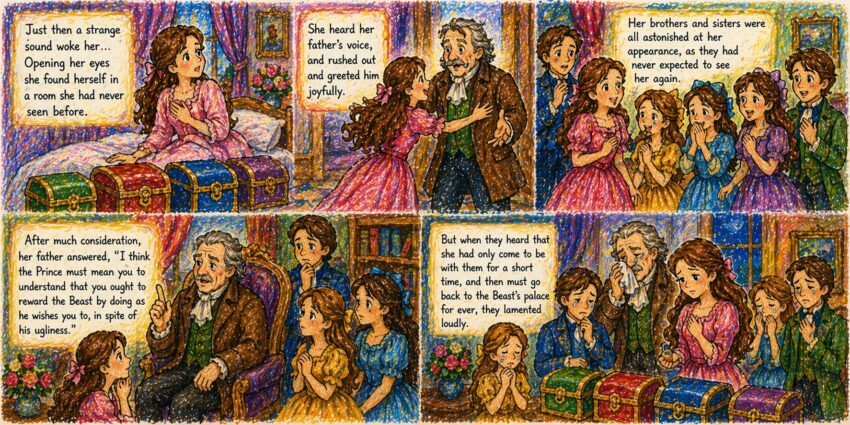 Beauty and the Beast by Andrew Lang Part 11: Return to Family Just then a strange sound woke her — someone was speaking not very far away. Đúng lúc đó một tiếng động lạ đánh thức cô — có người đang nói chuyện không xa lắm. And opening her eyes she found herself in a room…