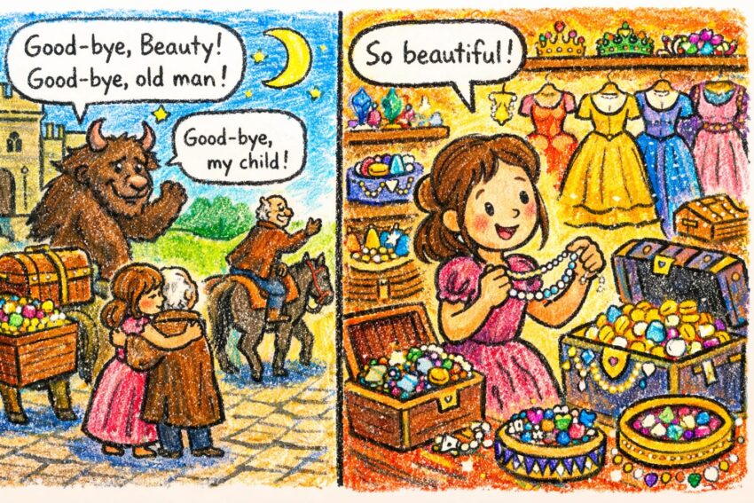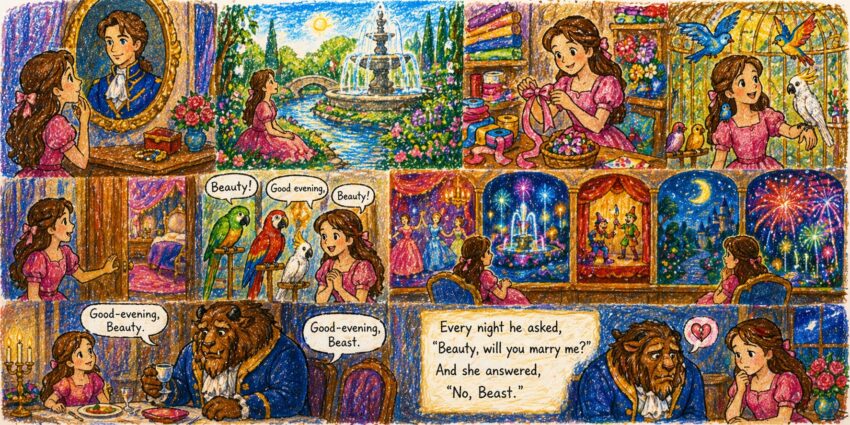 Beauty and the Beast by Andrew Lang Part 8: First Night with the Beast: Then he went away, after saying, “Good-by, Beauty; good-by, old man.” Rồi nó rời đi sau khi nói, “Tạm biệt, Beauty; tạm biệt, ông già.” And though Beauty was beginning to think with great dismay of her father’s departure, she was afraid…