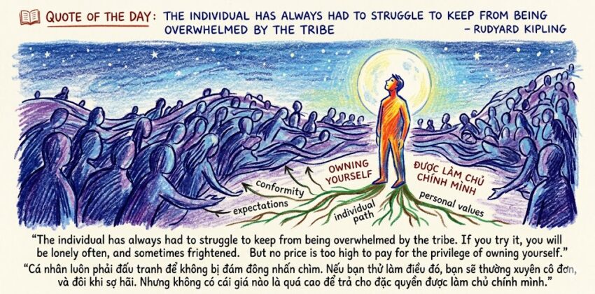 📖 “The Individual Has Always Had to Struggle to Keep from Being Overwhelmed by the Tribe” by Rudyard Kipling Let’s begin with the full quote: Hãy bắt đầu với câu trích dẫn đầy đủ: “The individual has always had to struggle to keep from being overwhelmed by the tribe. If you try it, you will be lonely often, and…