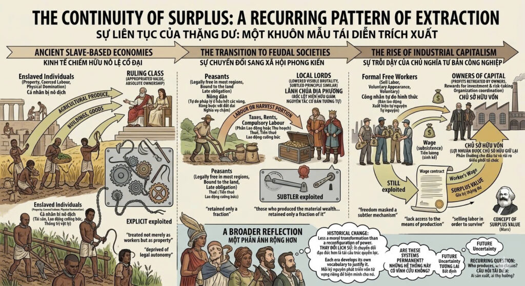 Nevertheless, the historical comparison remains provocative. Across slavery, feudalism, and capitalism, the institutional arrangements differ dramatically, yet each system establishes mechanisms through which a portion of the value created by producers is transferred upward. What changes is not the existence of surplus extraction but the legal, political, and ideological frameworks that justify it.