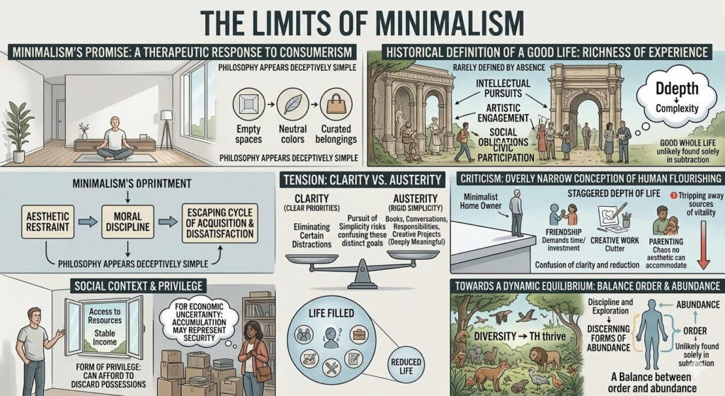 Theo nghĩa này, chủ nghĩa tối giản có nguy cơ nhầm lẫn giữa hai mục tiêu khác biệt: sự rõ ràng và sự cắt giảm. Một cuộc sống được tổ chức xoay quanh các ưu tiên rõ ràng thực sự có thể đòi hỏi việc loại bỏ một số yếu tố gây xao nhãng. Nhưng sự rõ ràng không nhất thiết kéo theo sự khắc khổ. Một người có thể dẫn dắt một cuộc đời chứa đầy sách vở, những cuộc trò chuyện, các trách nhiệm và những dự án sáng tạo — một cuộc đời trông có vẻ đông đúc nhưng vẫn giữ được ý nghĩa sâu sắc. Sự theo đuổi sự đơn giản, nếu được diễn giải quá cứng nhắc, có thể vô tình tước đi chính những nguồn lực của sức sống.