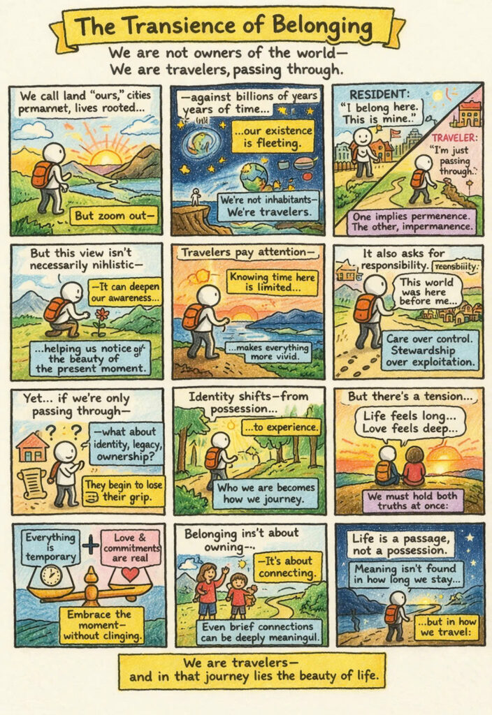 In this light, the metaphor of the traveler does not negate belonging but reframes it. One may belong not by owning or controlling, but by participating — by forming connections that, while finite, are nonetheless real. The value of these connections does not depend on their permanence, but on their intensity and sincerity.