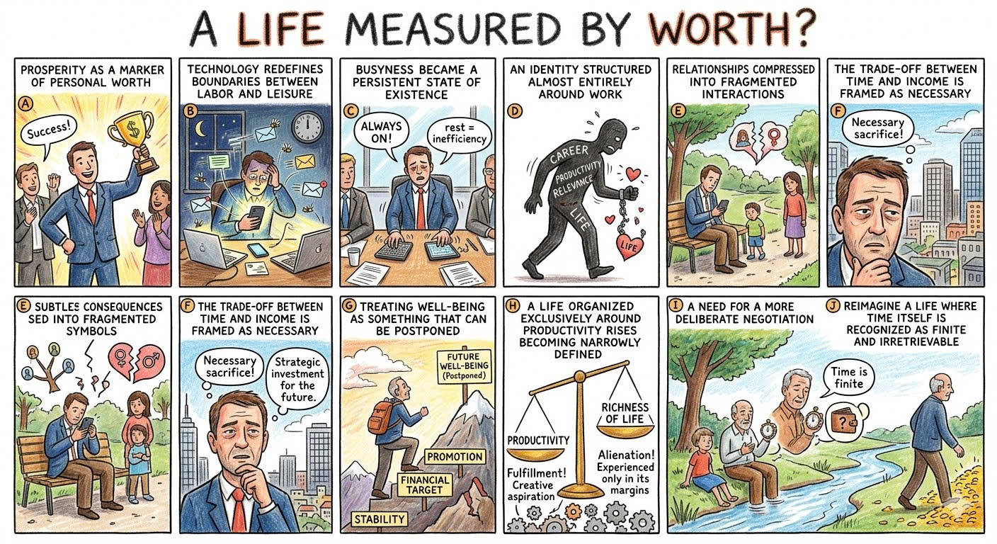Critics of the culture of busyness argue that the issue is not simply one of time management but of value orientation. A life organized exclusively around productivity risks becoming narrowly defined, its richness reduced to measurable outputs. The question, then, is not whether work is important — it undeniably is — but whether it has been granted a disproportionate role in shaping human existence.